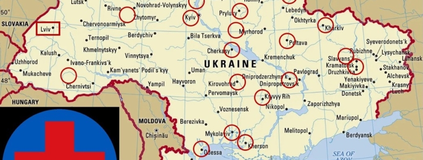 Each circle represents one or more ambulance delivered. Some towns and cities are marked, others such as Bucha in the north, or Velykyi Rozhyn (where the school is) in the south-west, are less obvious